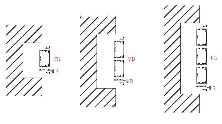 所有型号都可以嵌入混凝土墙或任意石膏板中安装。除此之外,可以完全集成到 HPL 面板中。该安装方式特别适用于需要满足所有医疗要求的细长形而简洁的设计。此配置可选配水平或垂直方向,装置本身可配备单个、两个或多个构件。