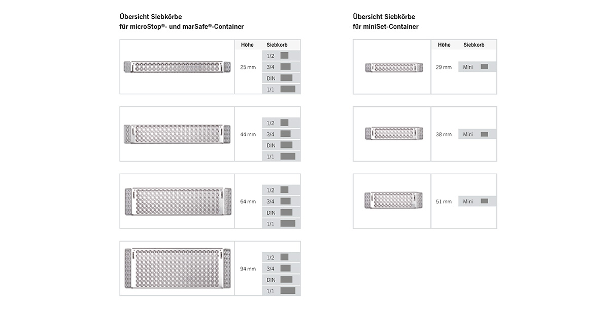 Das neue Siebkorbsystem marTray® ist in vier verschiedenen Größen und vier verschiedenen Höhen erhältlich. Daneben auch in einer speziellen mini Variante. Optional bieten wir für jede Siebkorbgröße einen Deckel, der ganz einfach durch Umlegen der Griffe am Siebkorb arretiert werden kann. Durch die perfekte Stapelbarkeit mit den optional erhältlichen Füßen können Sie mehrere Siebkörbe in einem Sterilisationscontainer benutzen.
