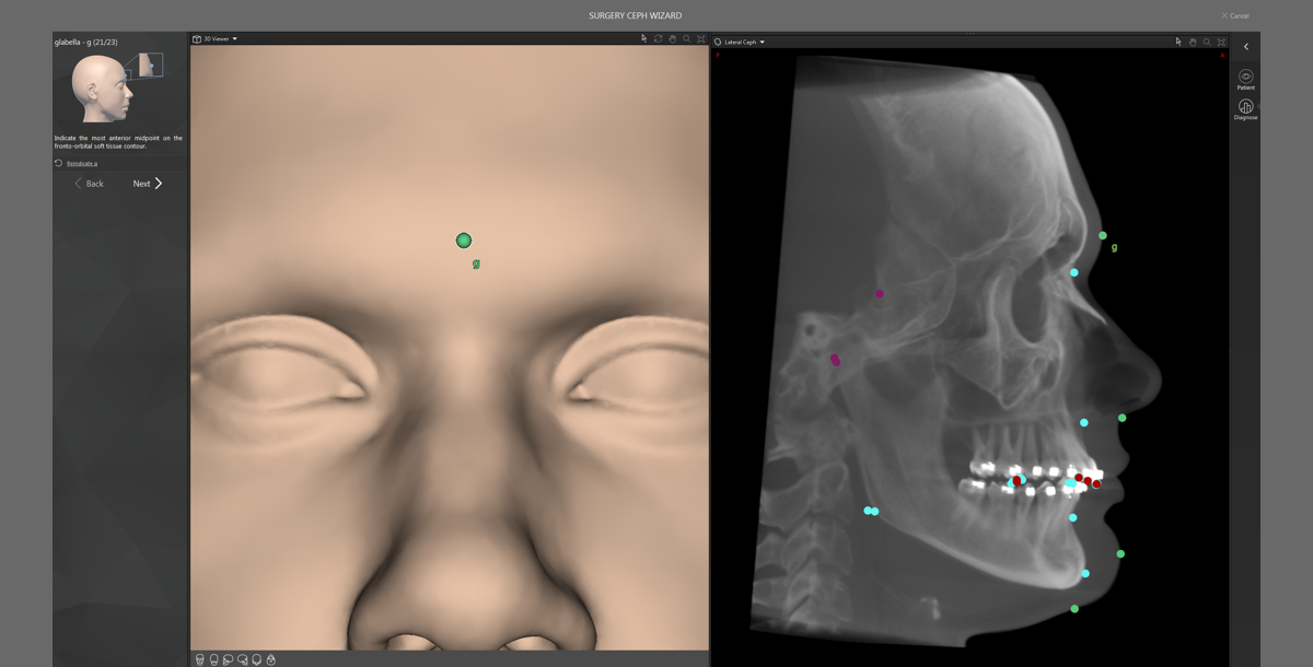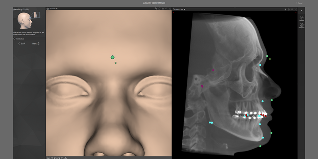 Diagnostic tools, such as the Surgery Ceph Wizard, make the plotting of desired landmarks, dimensions,and planes straightforward. The cephalometric values update live during the planning session and are clearly visible.