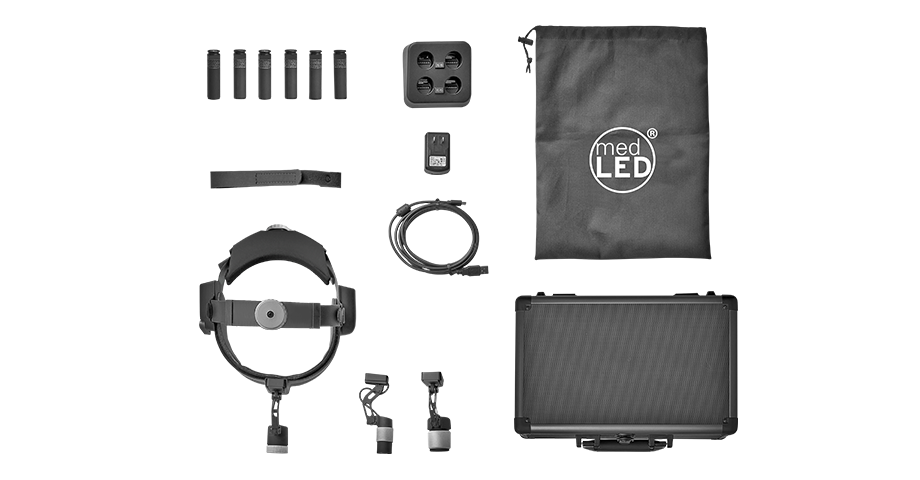 Consisting of: headlight MedLED , carrying case, USB charging cable, PSU incl. adapter for US and two rechargeable lithium-polymer batteries