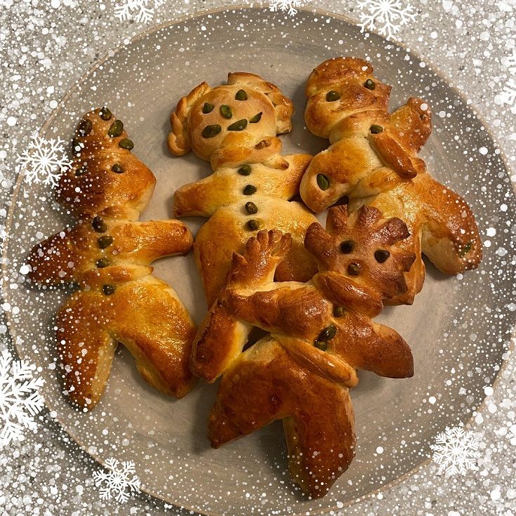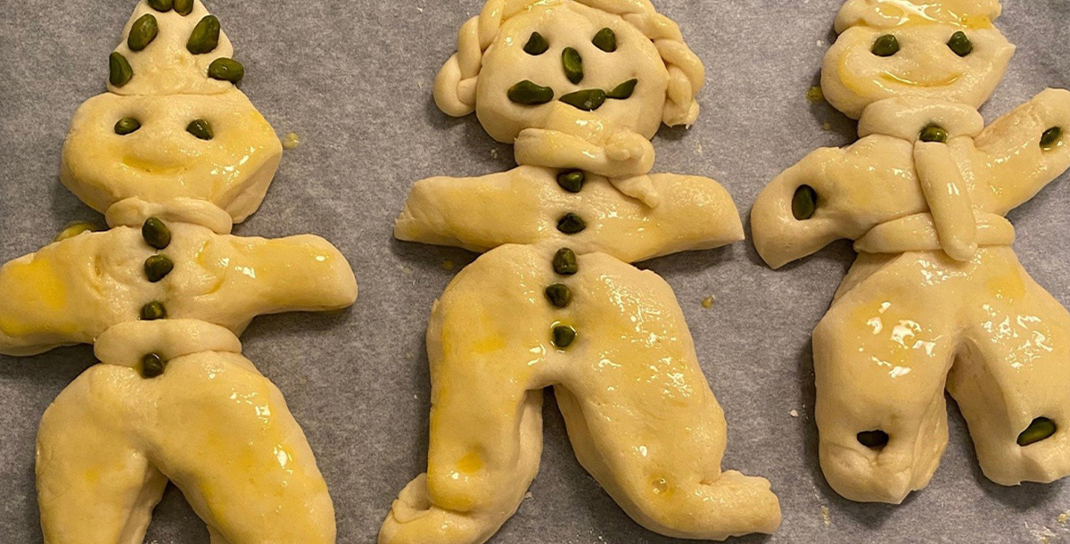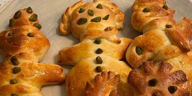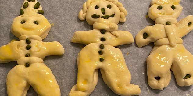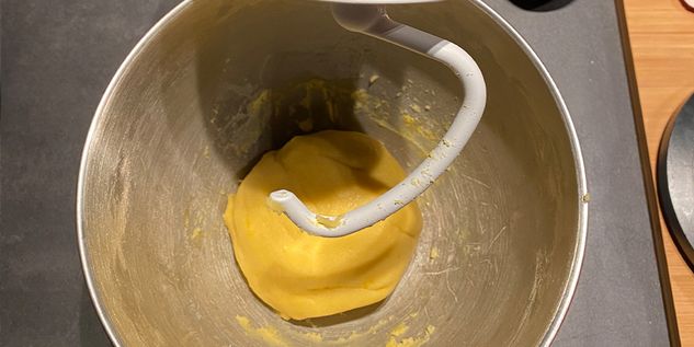 Pour the flour, crumbled yeast, sugar, soft butter in chunks, eggs, egg yolk, grated lemon peel, vanillin, and 80 ml water into the bowl of the mixer and knead with the dough hook at low speed, then while continuing to knead, add the remaining water and salt.