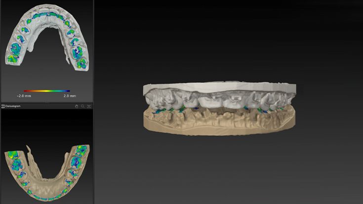 The virtual occlusion can be manually adjusted easily and intuitively. The distance between the dental cusps of the upper and lower jaw or a possible intersection is viewed in colors and is visible at a glance. Furthermore, plaster cast scans can be imported and the previously defined occlusion can be virtually adjusted easily.