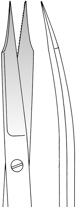 Scissors, acc. to Goldmann-Fox, curved, serrated, length 13 cm