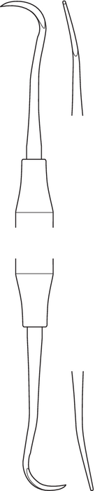 Scaler, acc. to Hygienist, incisors, premolars, mesial/distal, particularly good in the interdental space, figure H6/H7, width 1.2 mm, hollow handle, Ø 8 mm, length 17.5 cm