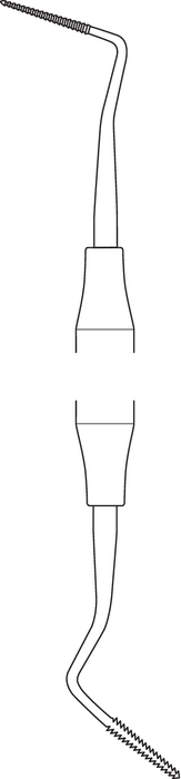 Periodontal file, modified, width 1.2 mm, hollow handle, Ø 8 mm, for removal of granulomatous tissue from supra- and infrabone pockets, length 17.5 cm