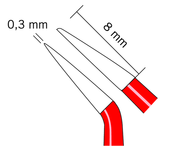 Bipolar forceps, angled, pointed, tip width 0.3 mm, length 12 cm