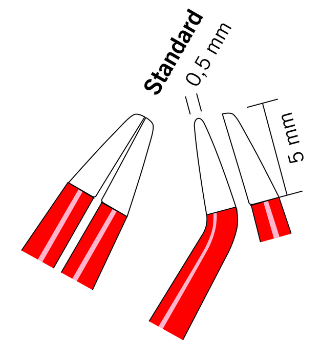 Bipolar forceps, nonStick red, curved, upward-bent, tip width 0.5 mm, length 23 cm